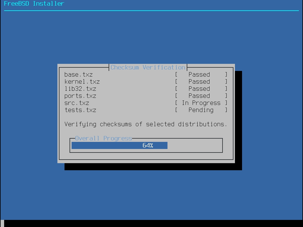 首先,安装程序会格式化所选的磁盘并初始化分区。接下来,在使用 bootonly media/mini memstick 的情况下,它会下载所选组件: