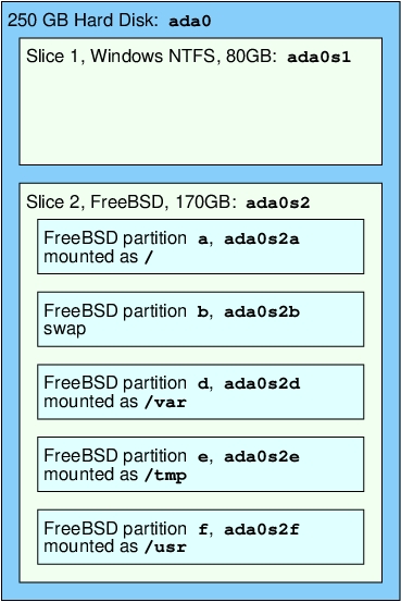 下图展示了 FreeBSD 对系统中第一个 SATA 磁盘的视图。假设该磁盘大小为 250 GB,其中包含一个 80 GB 的切片和一个 170 GB 的切片(MS-DOS® 分区)。第一个切片包含一个 Windows® 的 NTFS 文件系统(C:),第二个切片则用于 FreeBSD 安装。本例中的 FreeBSD 安装包含四个数据分区和一个交换分区。
